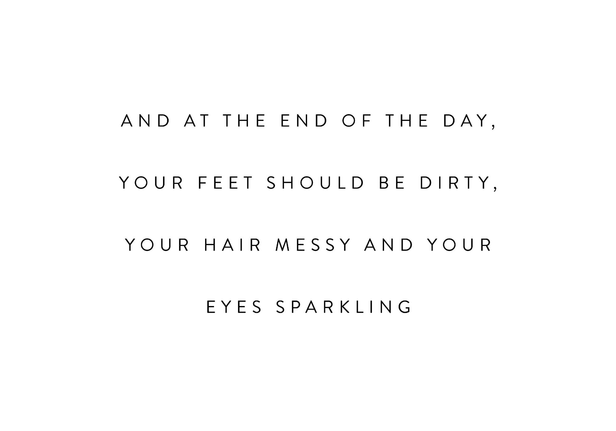 하루가 끝나면 발과 머리가 엉망이어야 하고, 눈이 반짝여야 합니다, 라는 동기부여 내용이 담긴 영문 타이포그래피 포스터입니다.문구: "And at the end of the day, your feet should be dirty, your hair messy and your eyes sparkling"