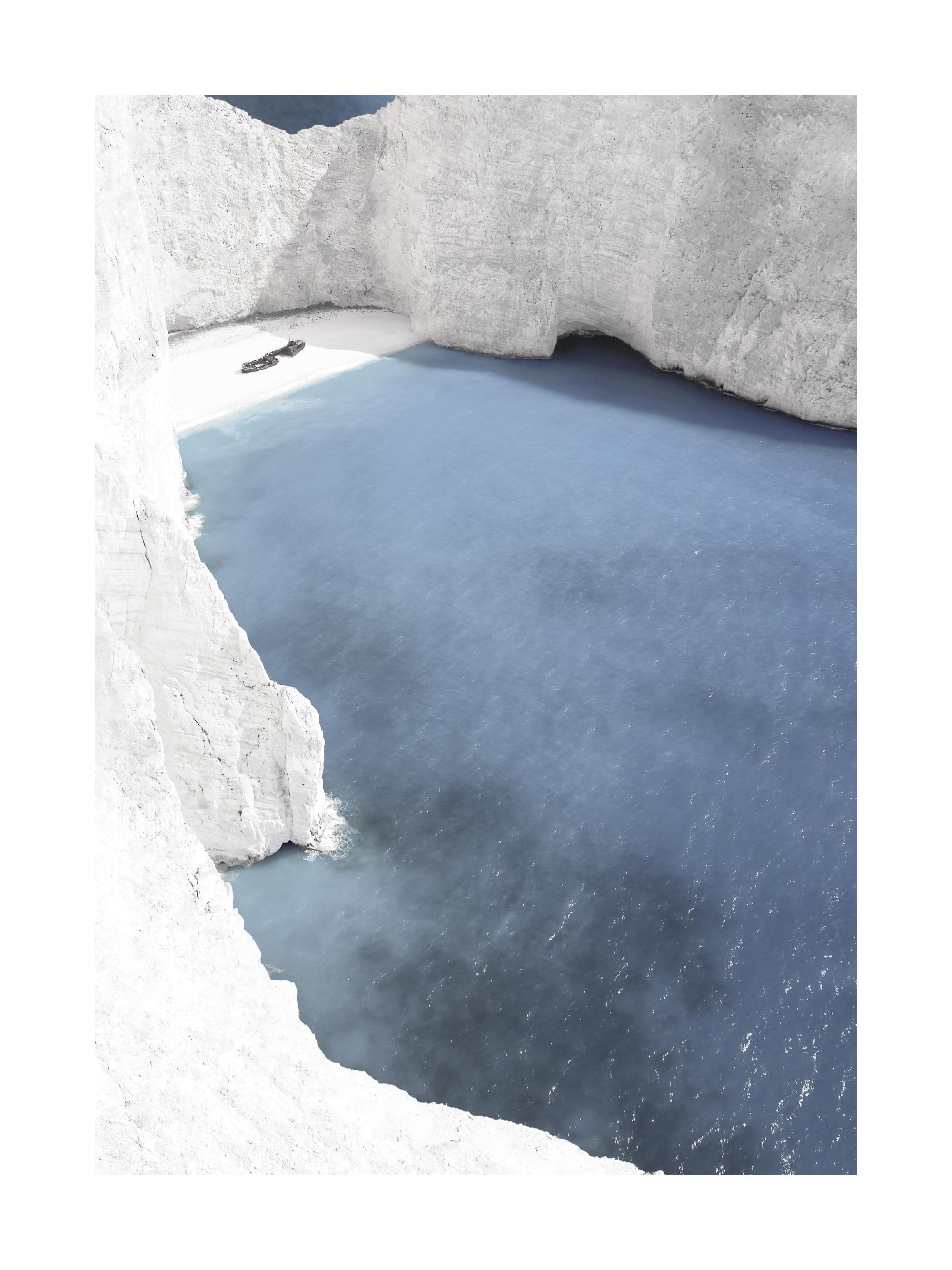 새하얀 절벽으로 둘러싸인 작은 해변가의 모습을 담은 바다 풍경 포스터입니다. 바다 색상과 절벽 색상이 차가우면서도 따뜻한 복합적인 느낌을 줍니다. 포스터 사이즈는 흰 여백을 포함한 사이즈입니다.