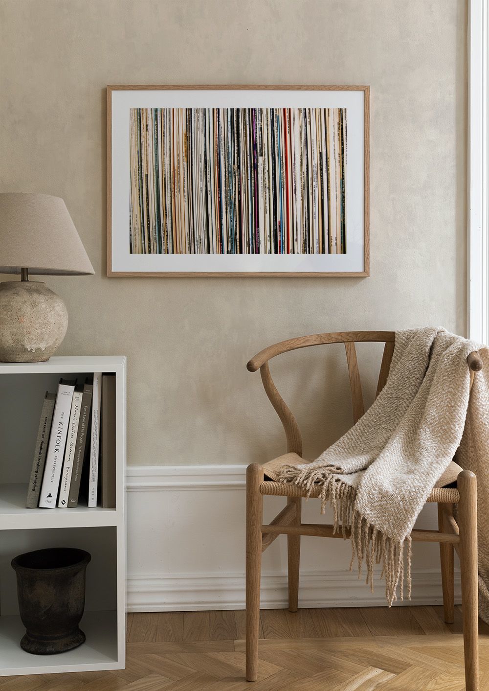 다채로운 비닐 레코드들이 나란히 서 있어요. 흰색, 검은색, 베이지색 레코드들이 줄무늬 패턴을 만들어요.