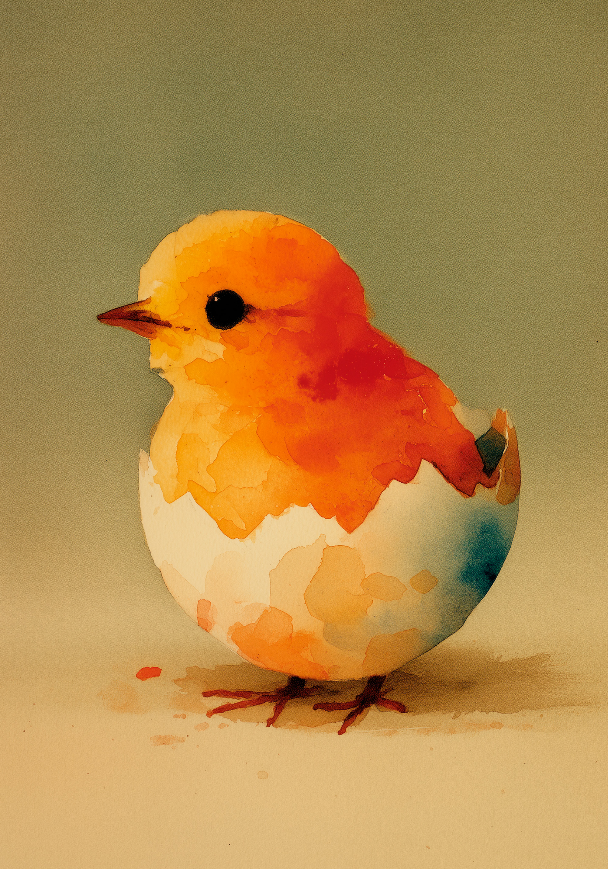 밝은 노란색과 주황색 병아리가 달걀 껍질 안에 서 있어요. 부드러운 수채화 스타일로 그려진 귀여운 봄 포스터예요.