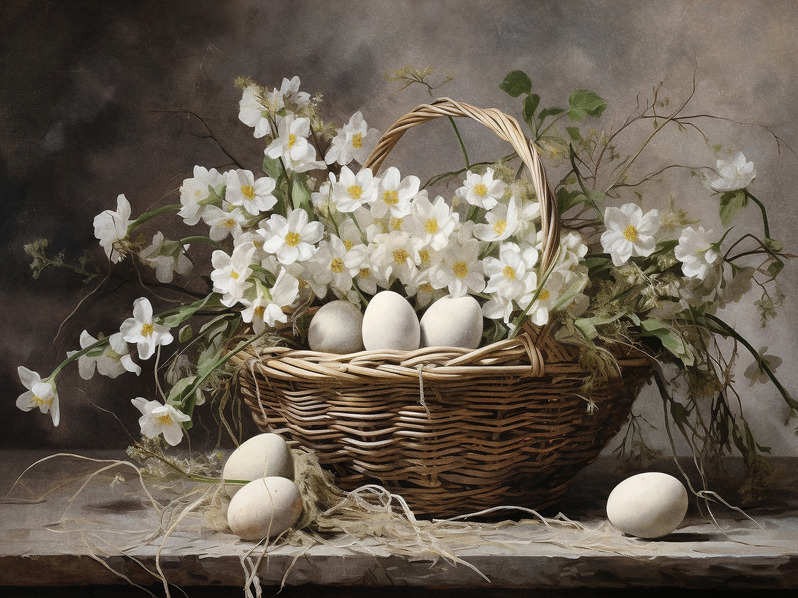 흰 꽃과 계란이 담긴 바구니가 나무 위에 놓여 있어요. 노란 꽃술과 초록 잎이 자연스럽고 따뜻한 느낌을 줘요.