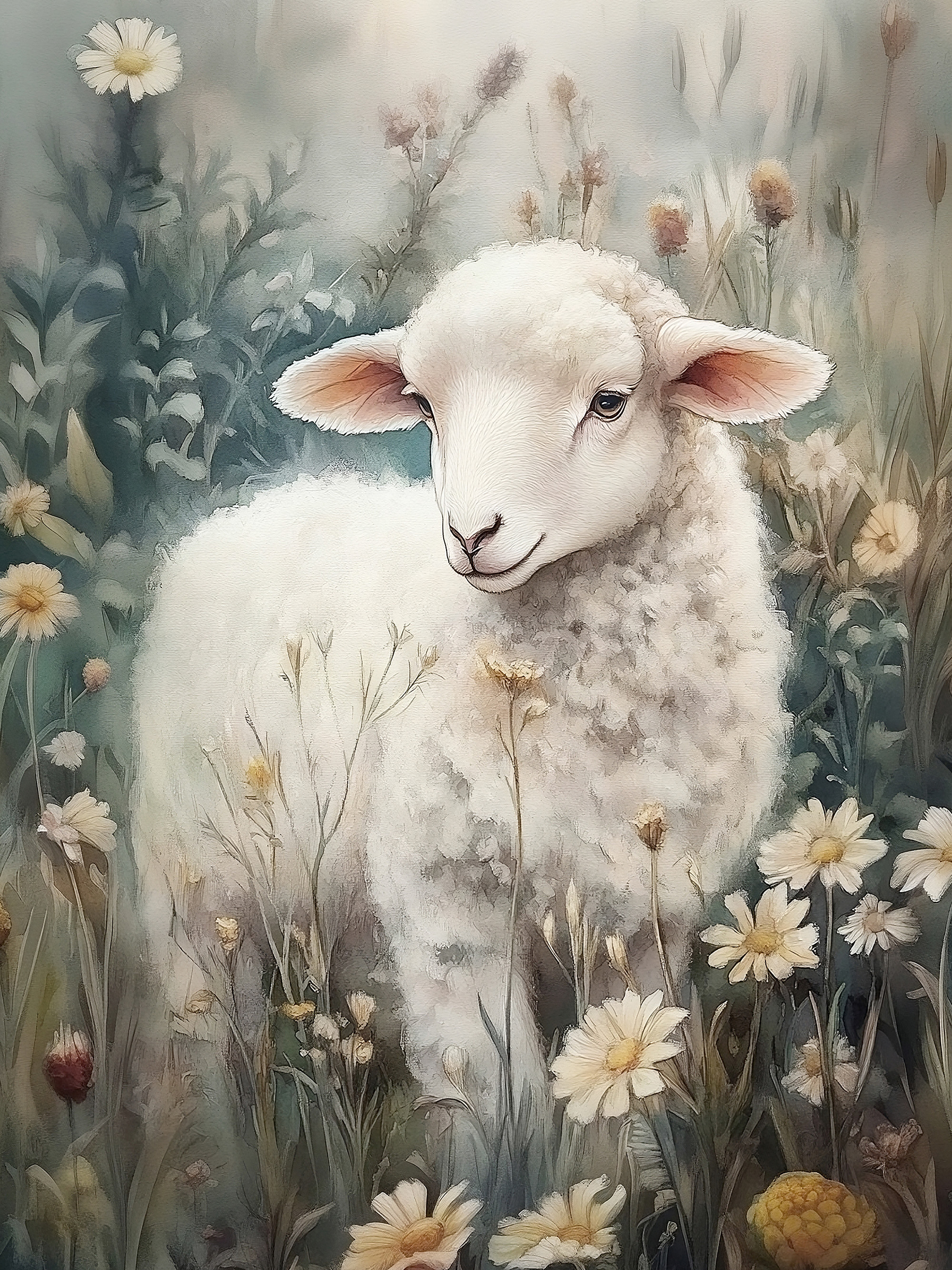 부드러운 하얀 양이 봄꽃 들판에 서 있어요. 노란색과 하얀색 꽃들이 양을 감싸고 있는 평화로운 포스터예요.