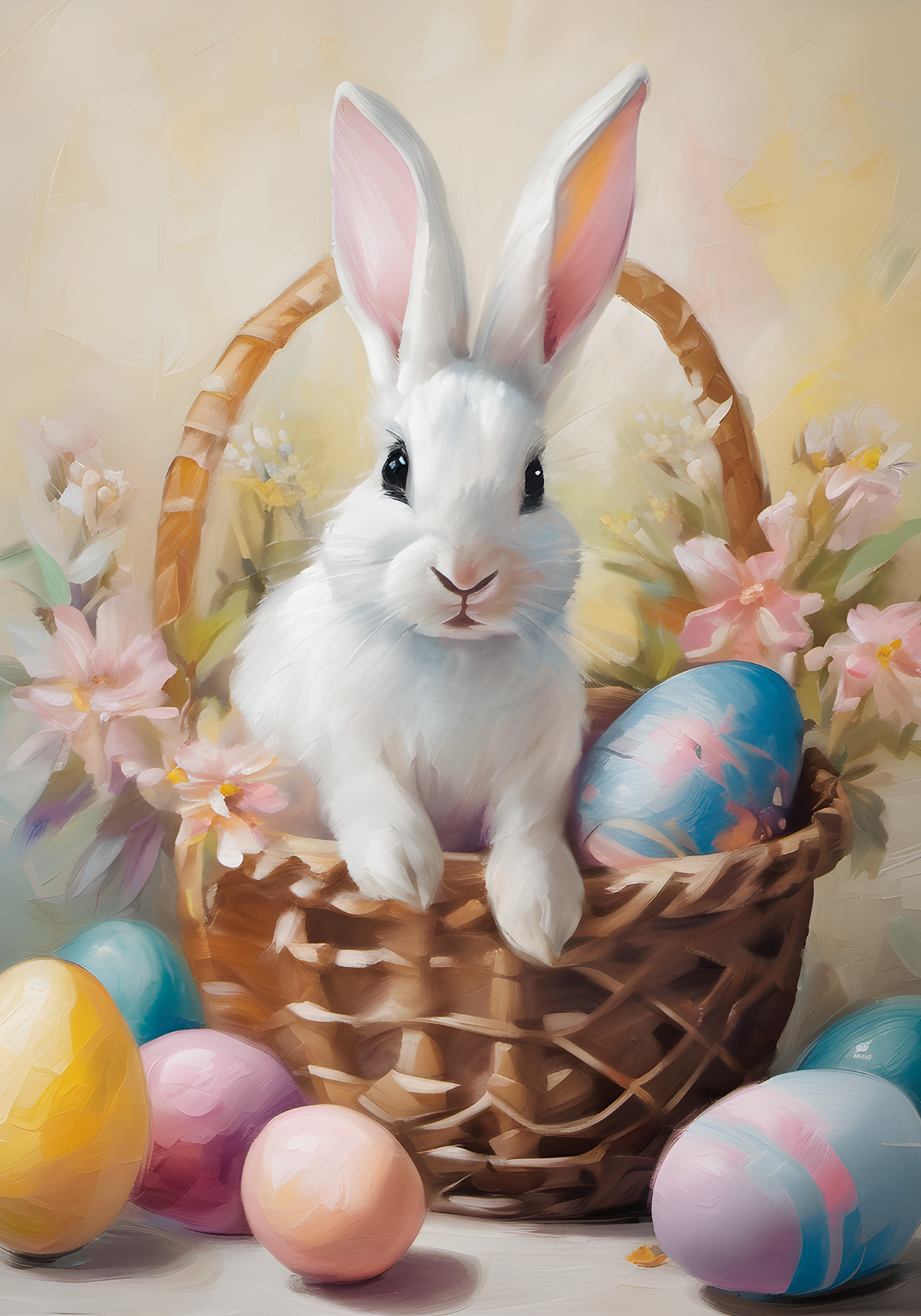 부활절 달걀과 함께 있는 귀여운 토끼 포스터예요. 분홍색 꽃과 알록달록한 달걀이 봄 분위기를 만들어요.
