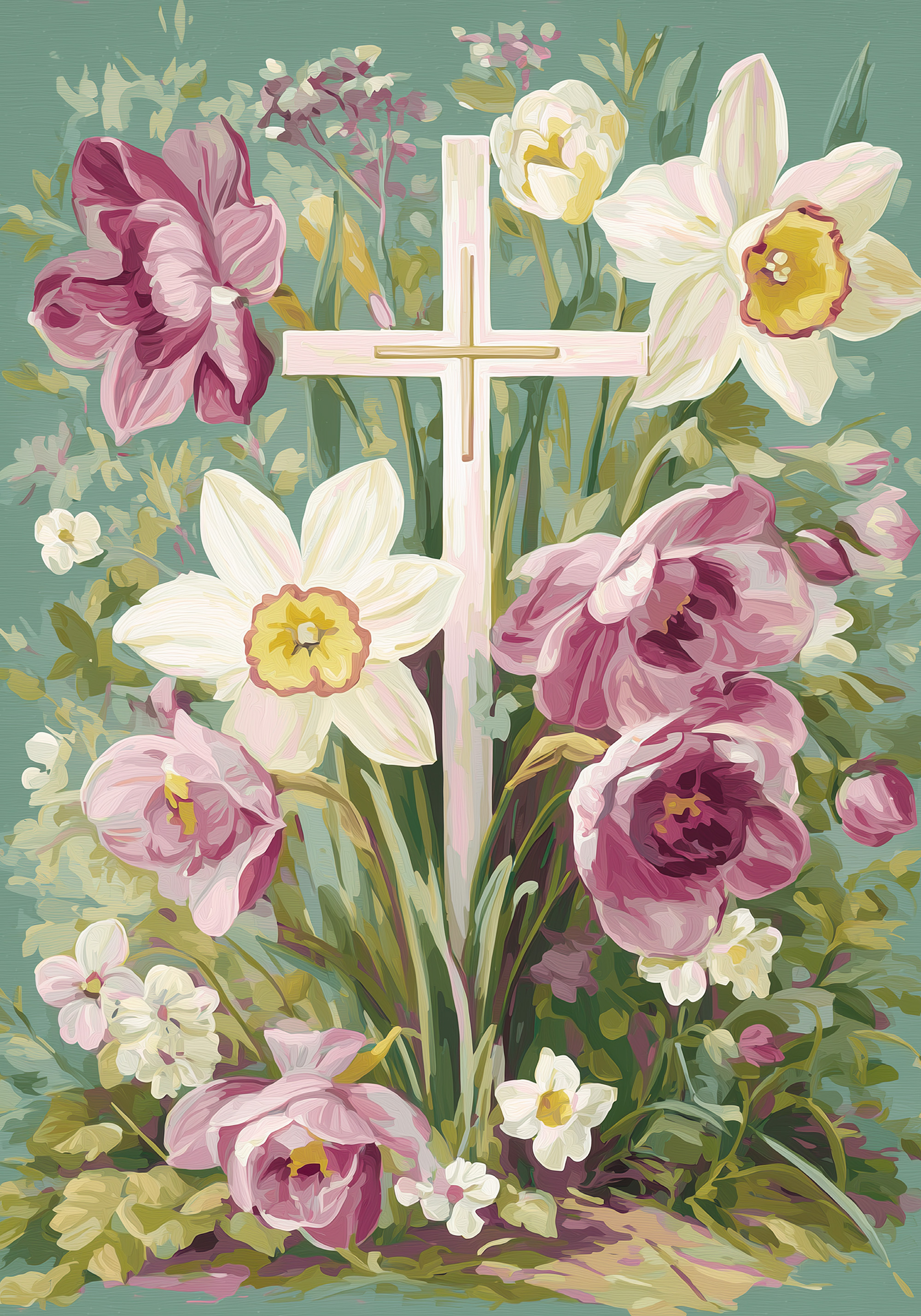 흰색 십자가를 둘러싼 아름다운 봄꽃들이 평화로운 분위기를 만들어요. 분홍색과 보라색 장미, 노란색과 흰색 수선화가 부드러운 파스텔 톤으로 표현된 포스터예요.