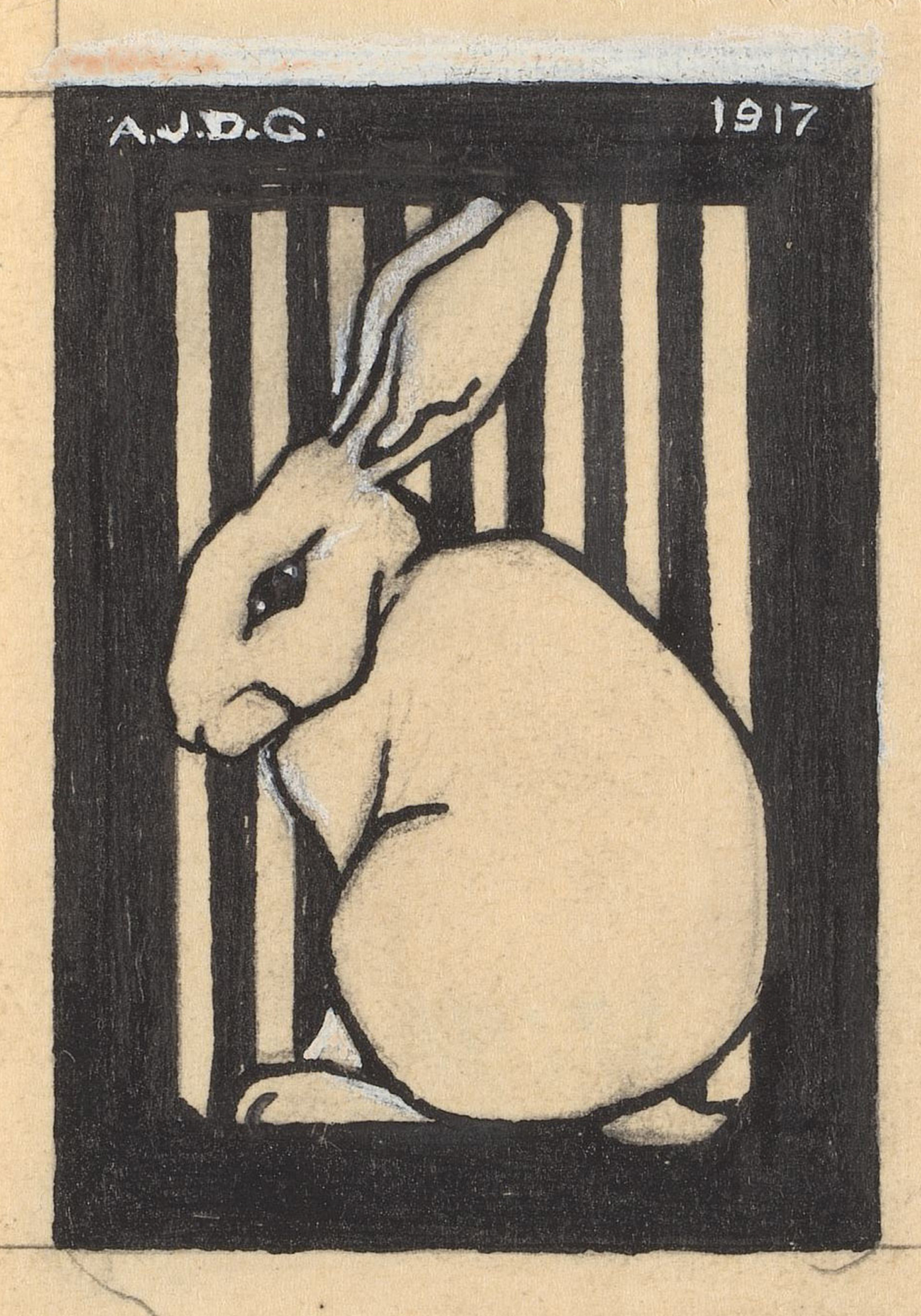 심플한 스타일로 그려진 크림색 토끼 포스터예요. 검은색 세로 줄무늬 배경과 연한 갈색 바탕이 어우러져 아트 데코 느낌을 줍니다.