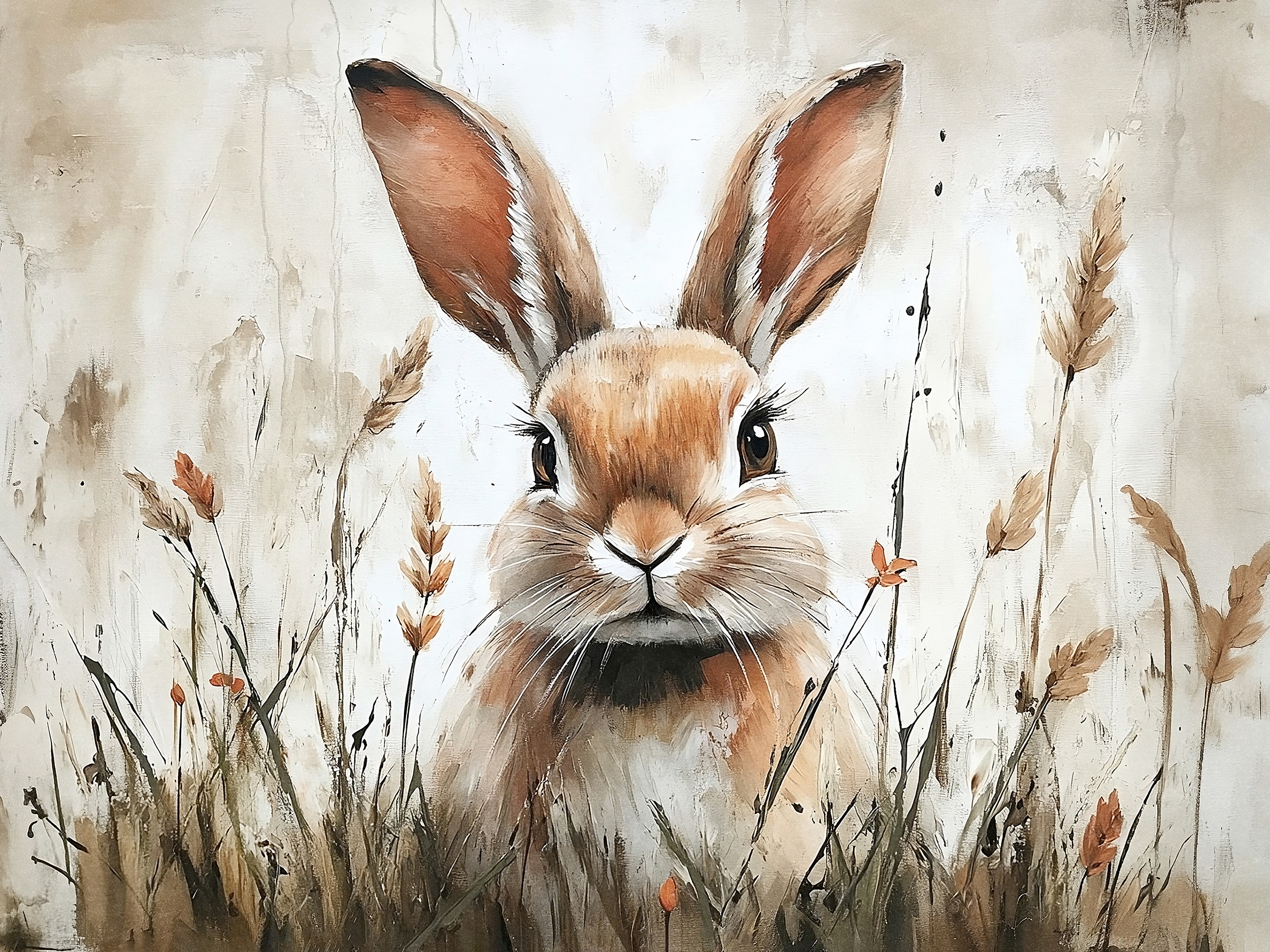 부드러운 갈색과 흰색 털을 가진 귀여운 토끼가 마른 풀과 작은 주황색 꽃 사이에 있어요. 따뜻하고 편안한 느낌을 주는 자연스러운 장면이에요.