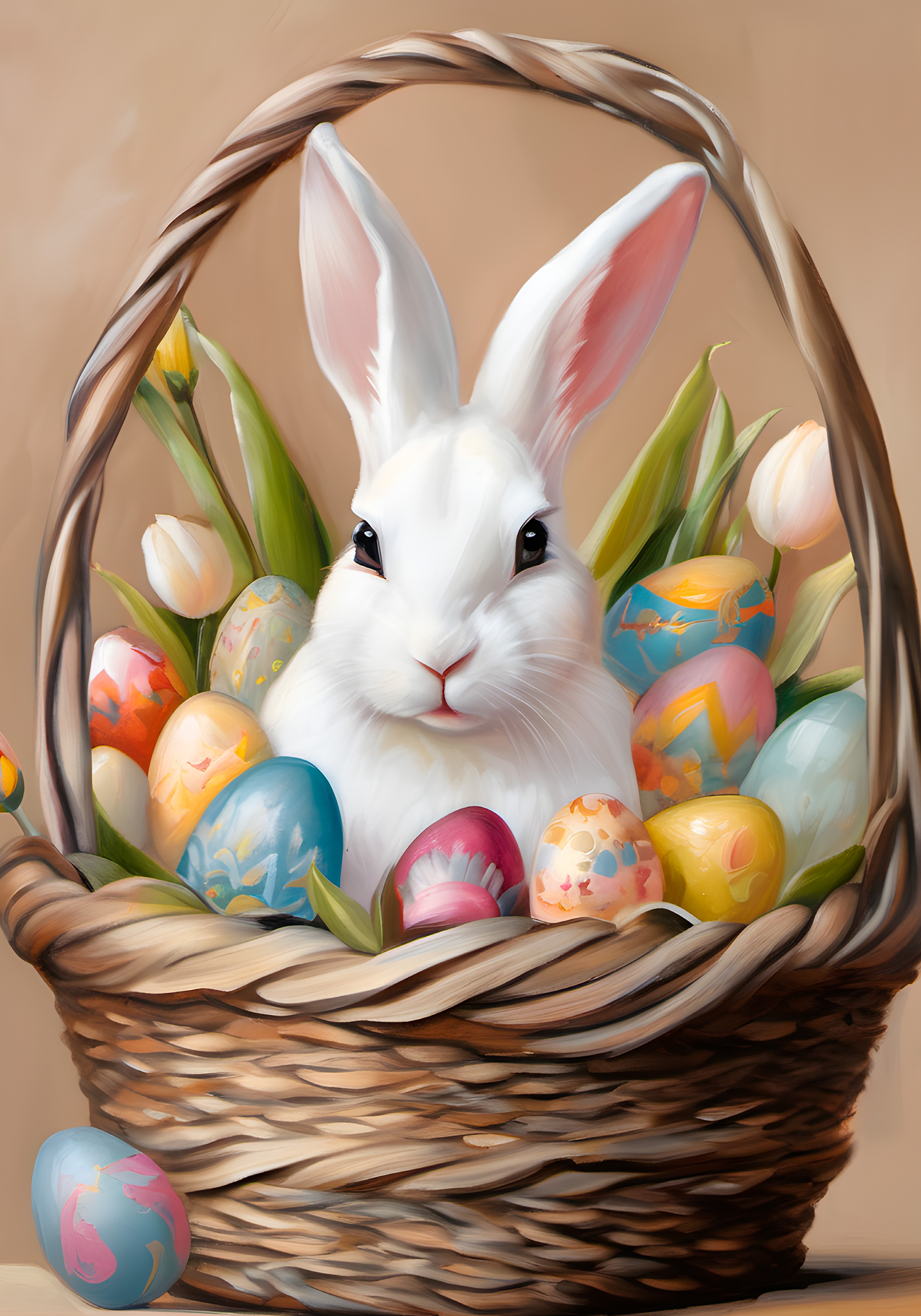 부드러운 베이지 배경 위에 하얀 토끼가 바구니에 앉아 있어요. 알록달록한 달걀과 하얀 튤립이 함께 있는 귀여운 부활절 포스터예요.