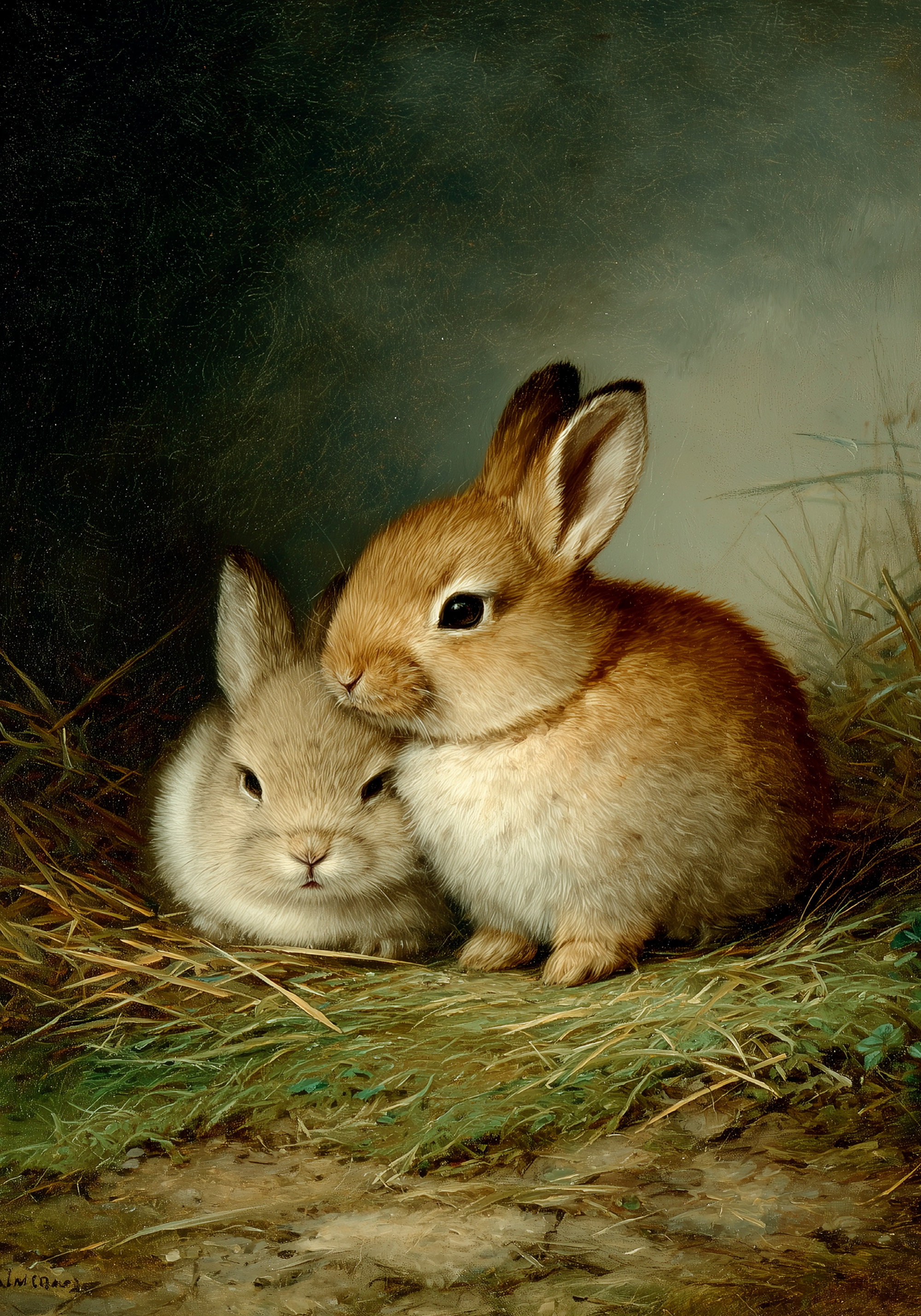 두 마리의 귀여운 토끼가 풀밭에서 함께 앉아있어요. 한 마리는 연한 갈색이고 다른 한 마리는 회백색이에요. 부드러운 털과 반짝이는 눈이 평화로운 느낌을 줍니다.