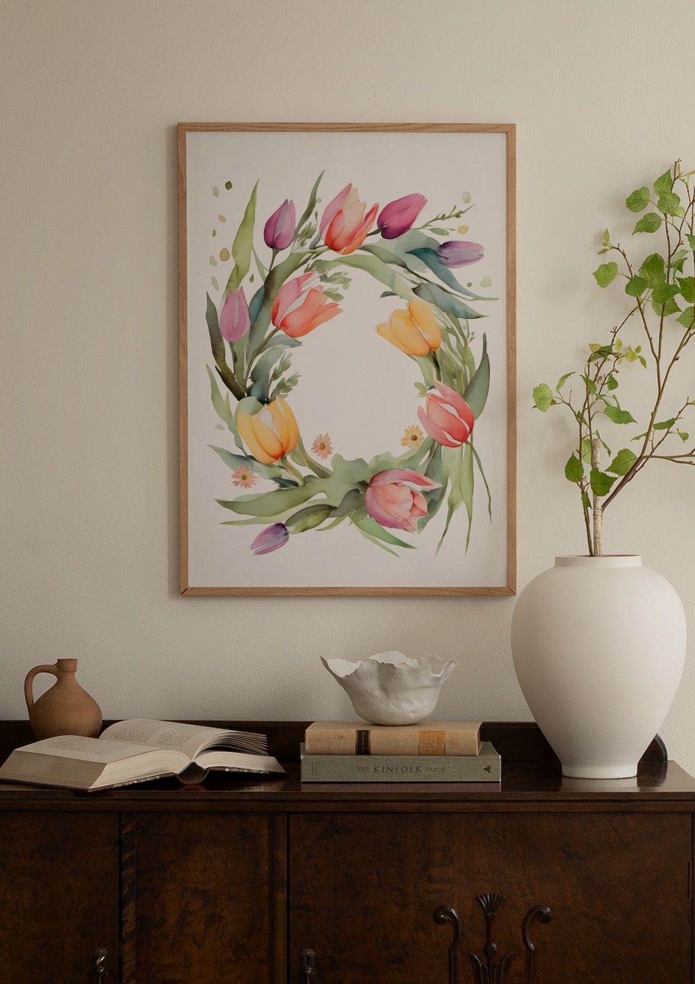 분홍색, 빨간색, 보라색, 노란색의 수채화 튤립으로 이루어진 꽃 화환이 그려진 아름다운 포스터입니다. 크림색 배경에 초록색 잎사귀와 작은 분홍색 꽃들이 섬세하게 어우러진 월 아트입니다.
